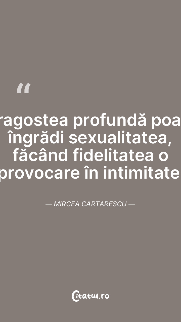 Dragostea profundă poate îngrădi sexualitatea, făcând fidelitatea o provocare în intimitate. Mircea Cartarescu