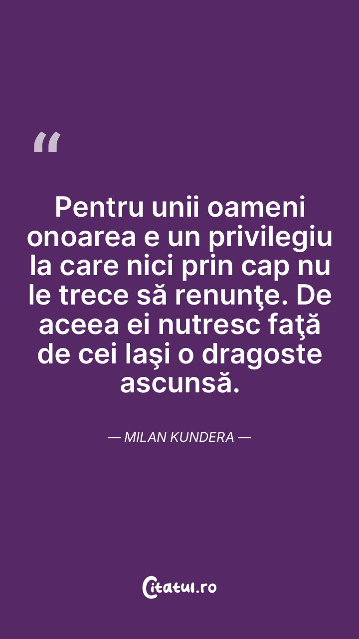 Pentru unii oameni onoarea e un privilegiu la care nici prin cap nu le trece să renunţe. De aceea ei nutresc faţă de cei laşi o dragoste ascunsă. Milan Kundera