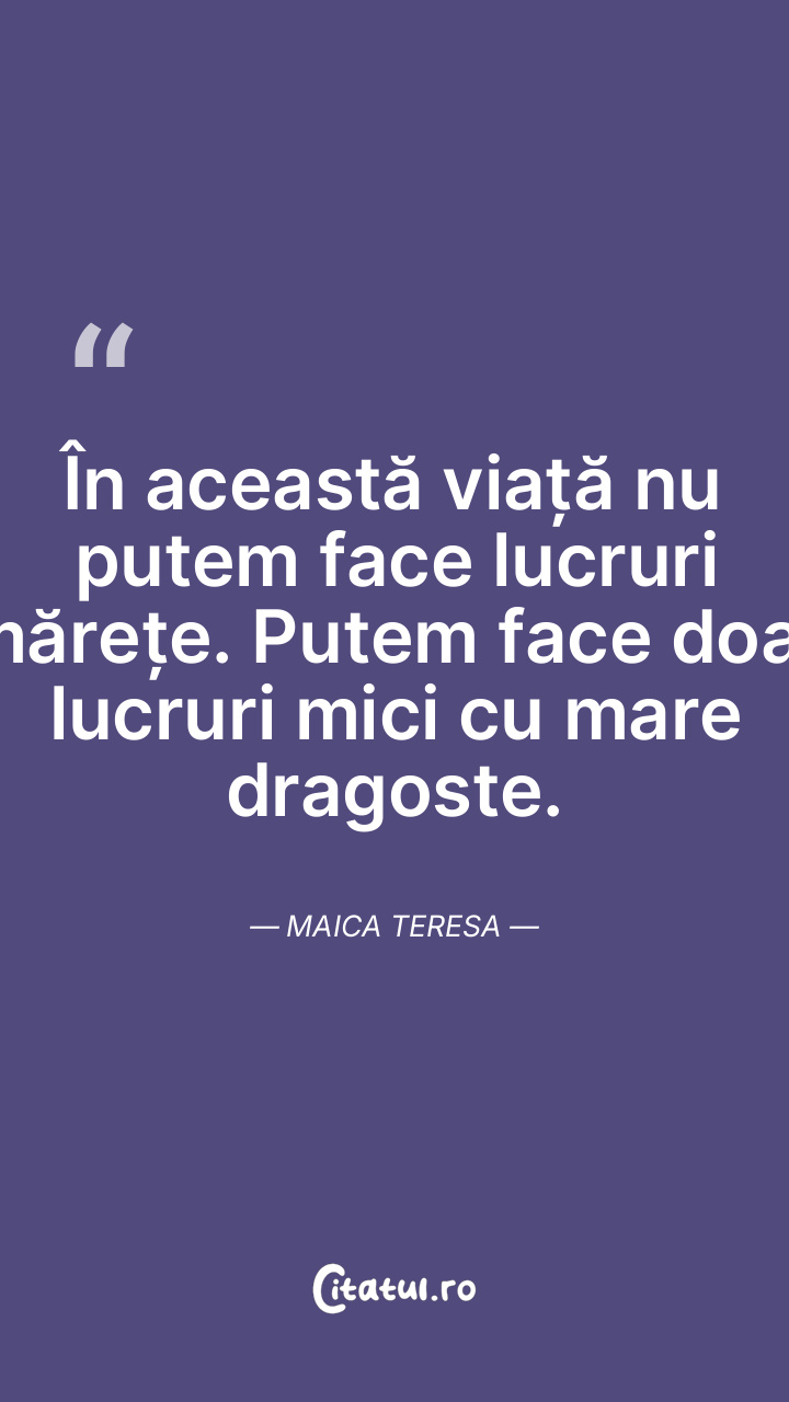 În această viață nu putem face lucruri mărețe. Putem face doar lucruri mici cu mare dragoste. Maica Teresa