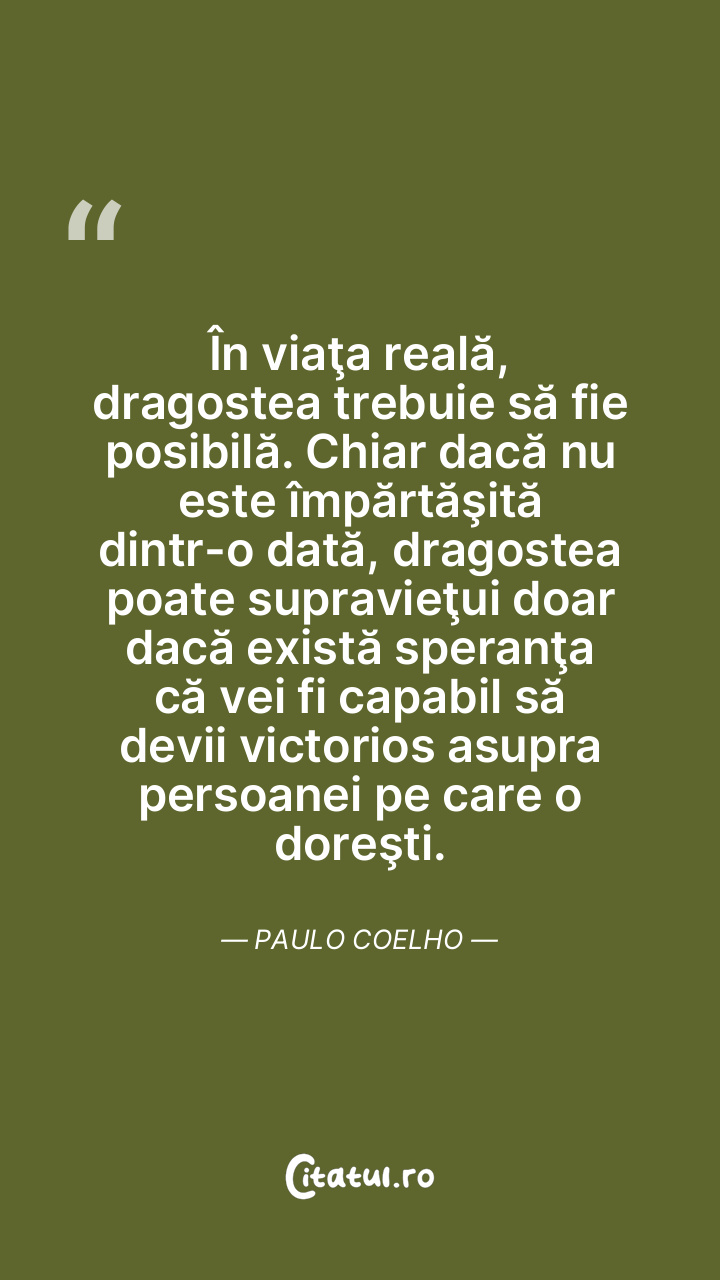 În viaţa reală, dragostea trebuie să fie posibilă. Chiar dacă nu este împărtăşită dintr-o dată, dragostea poate supravieţui doar dacă există speranţa că vei fi capabil să devii victorios asupra persoanei pe care o doreşti. Paulo Coelho