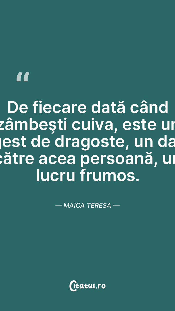 De fiecare dată când zâmbeşti cuiva, este un gest de dragoste, un dar către acea persoană, un lucru frumos. Maica Teresa