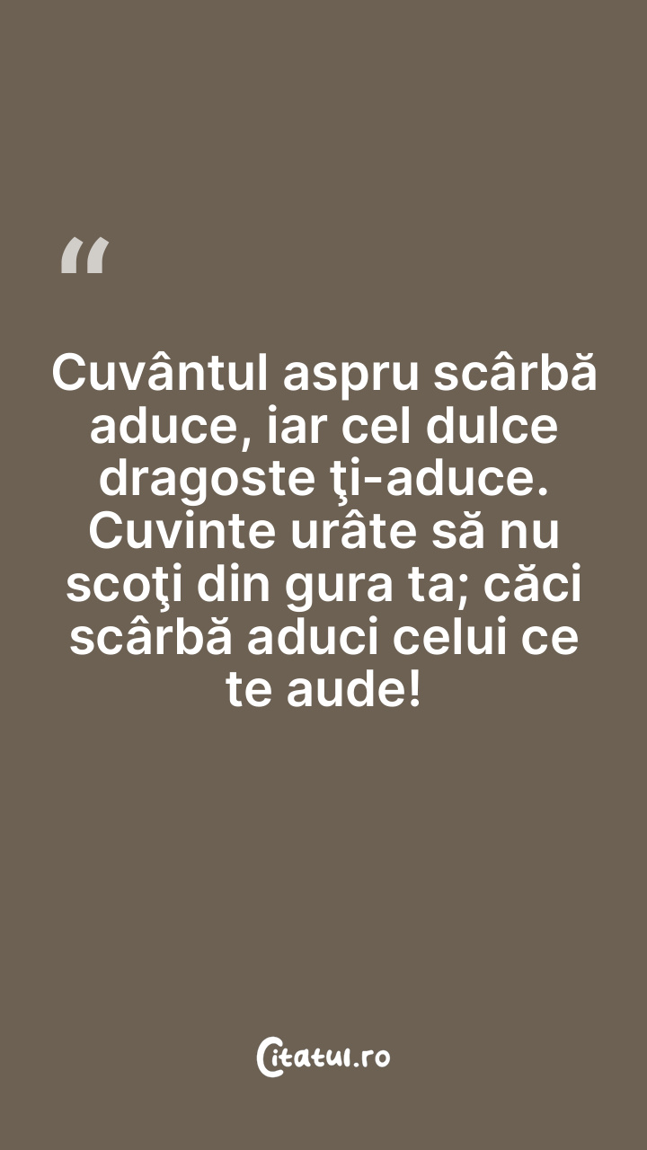 Cuvântul aspru scârbă aduce, iar cel dulce dragoste ţi-aduce. Cuvinte urâte să nu scoţi din gura ta; căci scârbă aduci celui ce te aude!