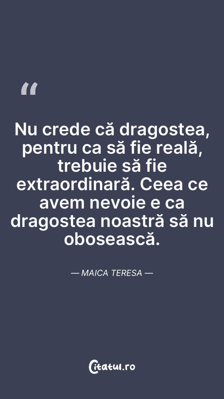 Nu crede că dragostea, pentru ca să fie reală, trebuie să fie extraordinară. Ceea ce avem nevoie e ca dragostea noastră să nu obosească. Maica Teresa