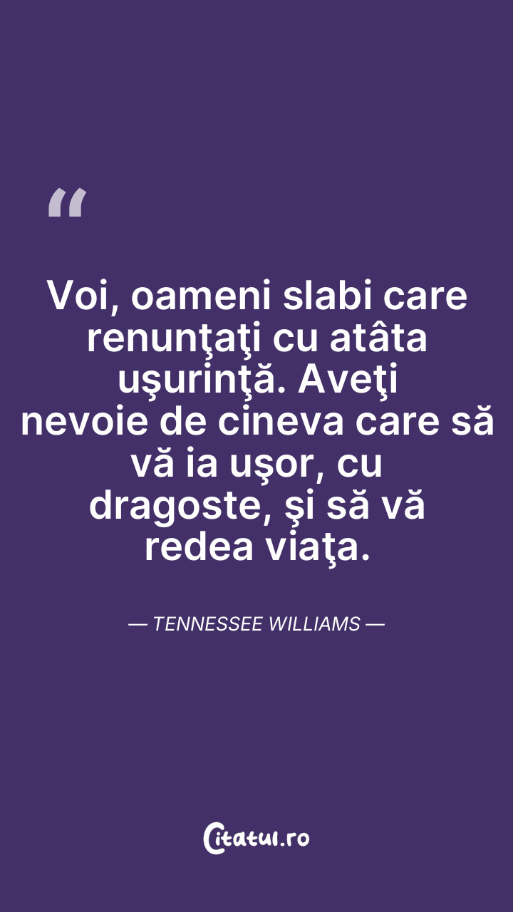 Voi, oameni slabi care renunţaţi cu atâta uşurinţă. Aveţi nevoie de cineva care să vă ia uşor, cu dragoste, şi să vă redea viaţa. Tennessee Williams