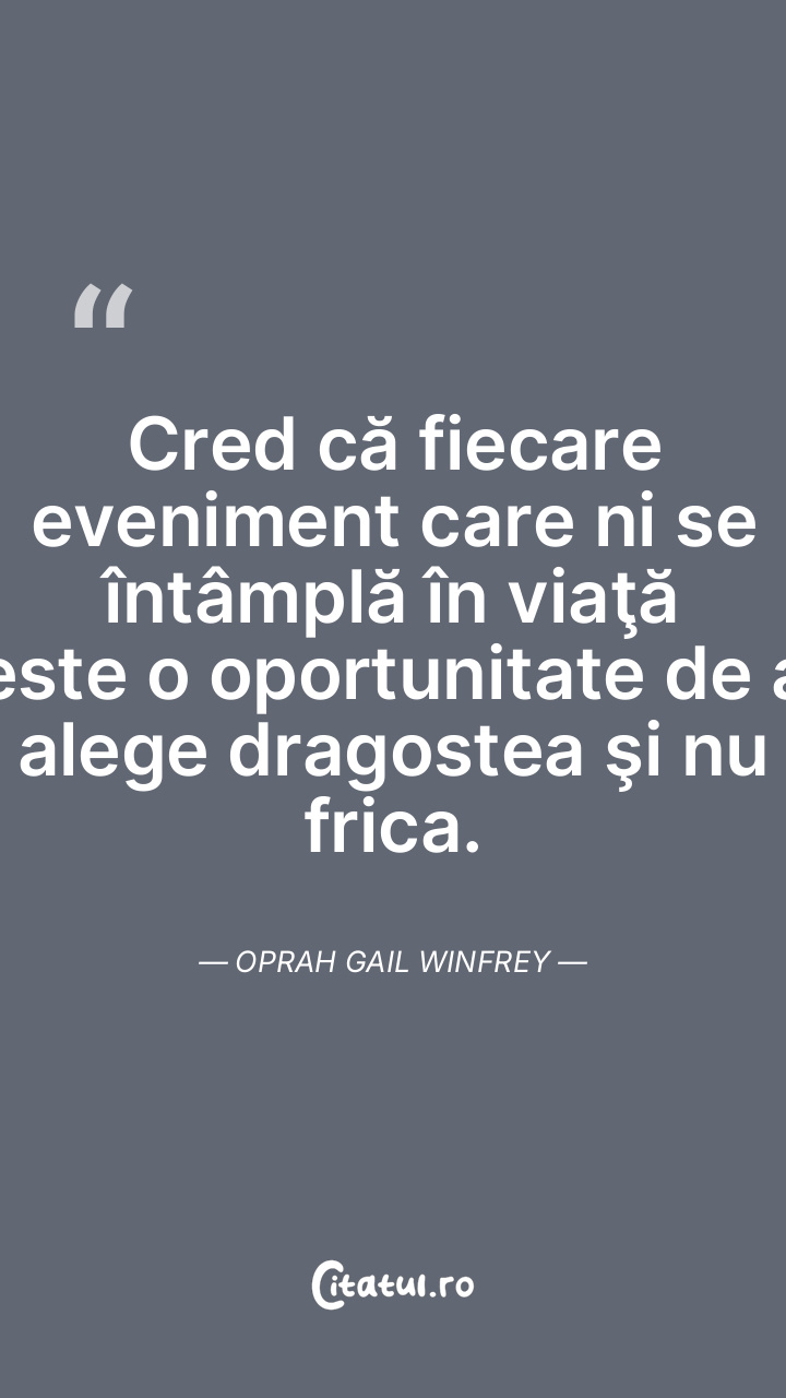 Cred că fiecare eveniment care ni se întâmplă în viaţă este o oportunitate de a alege dragostea şi nu frica. Oprah Gail Winfrey