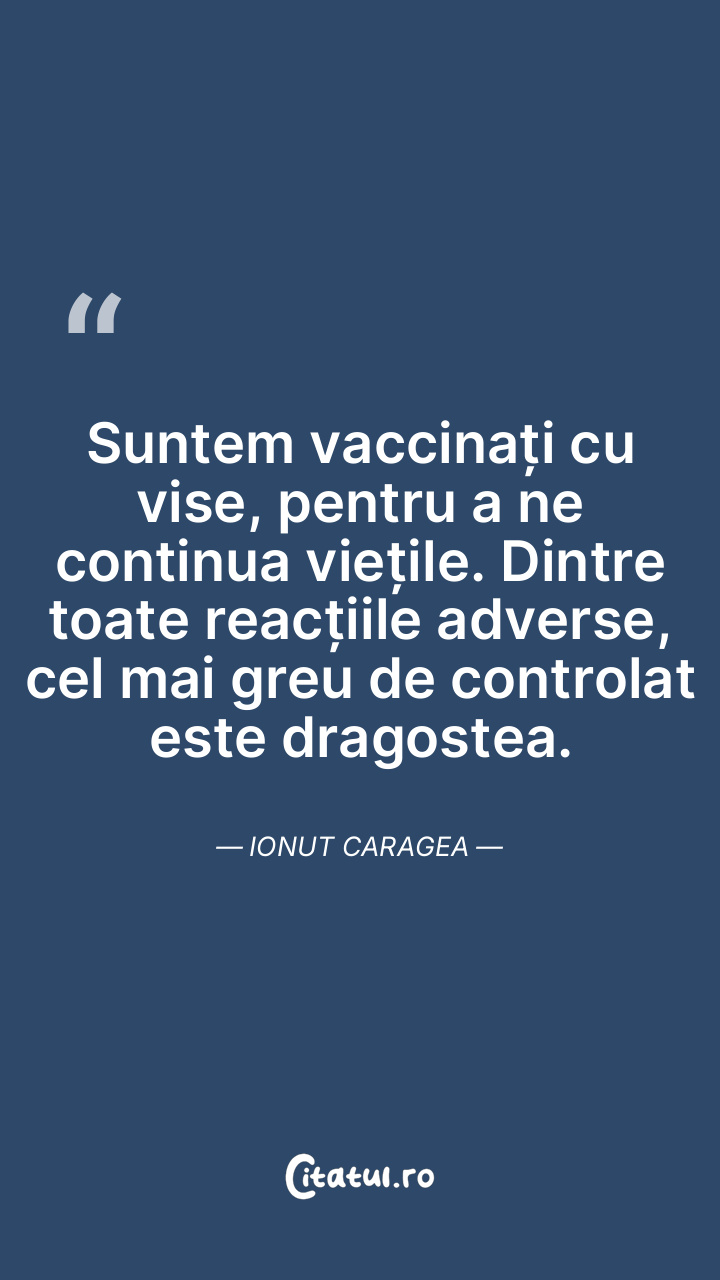 Suntem vaccinați cu vise, pentru a ne continua viețile. Dintre toate reacțiile adverse, cel mai greu de controlat este dragostea. Ionut Caragea