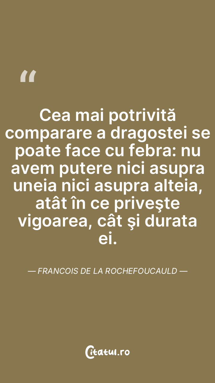 Cea mai potrivită comparare a dragostei se poate face cu febra: nu avem putere nici asupra uneia nici asupra alteia, atât în ce priveşte vigoarea, cât şi durata ei. Francois de la Rochefoucauld