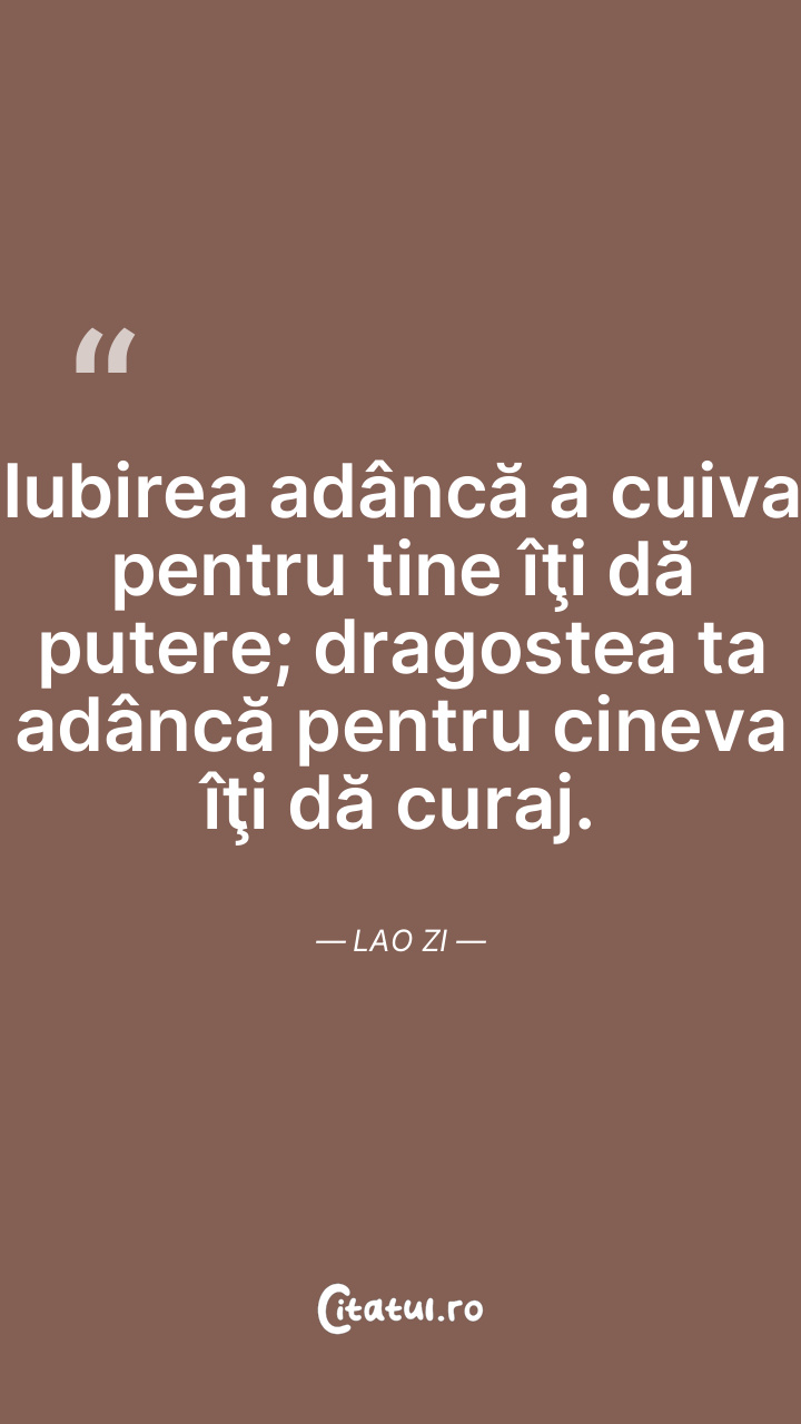 Iubirea adâncă a cuiva pentru tine îţi dă putere; dragostea ta adâncă pentru cineva îţi dă curaj. Lao Zi