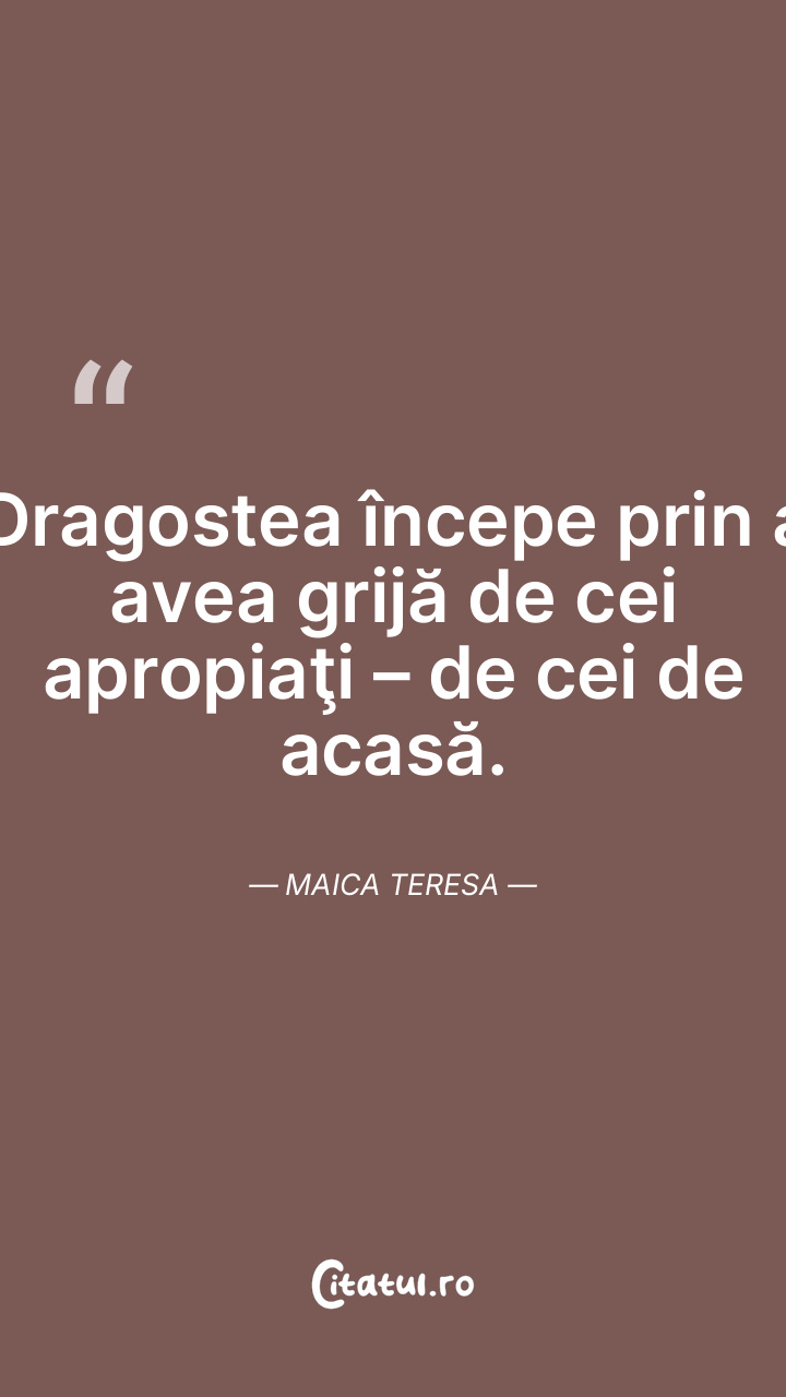 Dragostea începe prin a avea grijă de cei apropiaţi – de cei de acasă. Maica Teresa