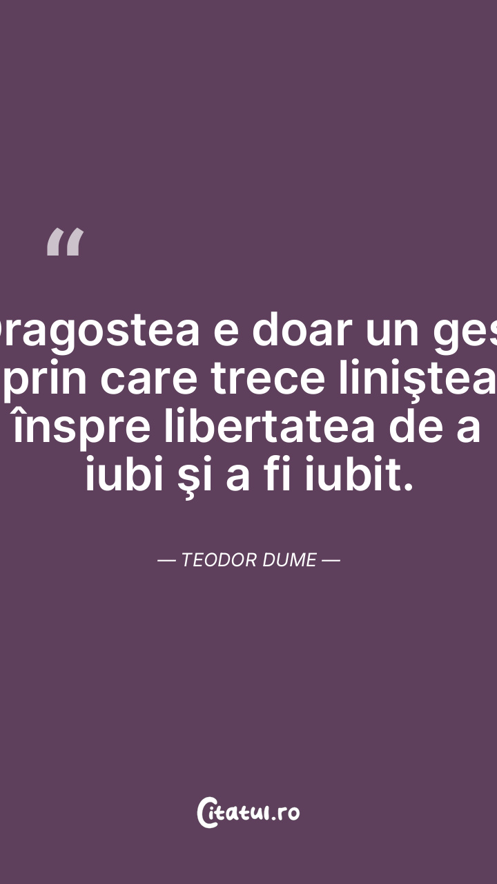 Dragostea e doar un gest prin care trece liniştea înspre libertatea de a iubi şi a fi iubit. Teodor Dume