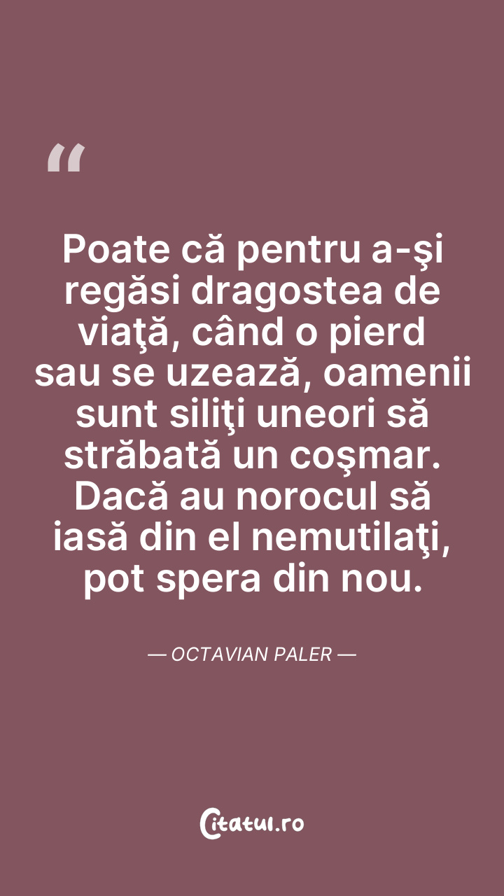 Poate că pentru a-şi regăsi dragostea de viaţă, când o pierd sau se uzează, oamenii sunt siliţi uneori să străbată un coşmar. Dacă au norocul să iasă din el nemutilaţi, pot spera din nou. Octavian Paler