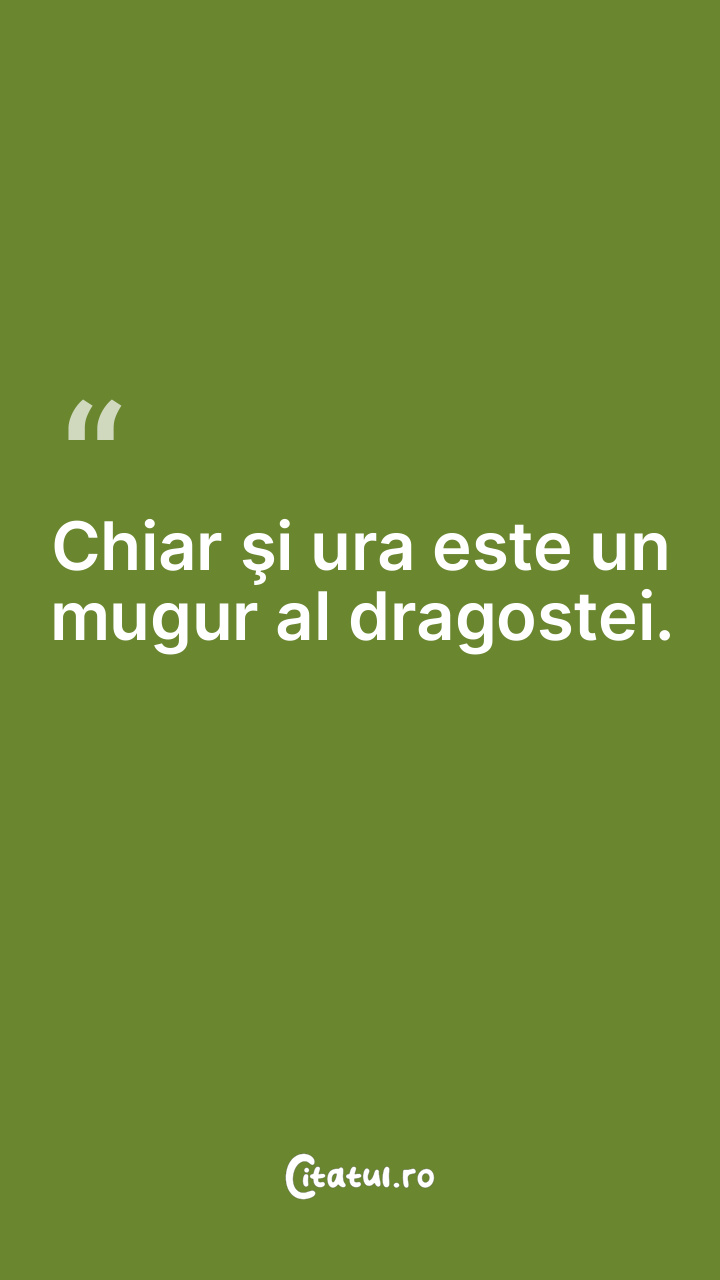 Chiar şi ura este un mugur al dragostei. ... Categorie: citate dragoste Dificultate: Ușor de citit și înțeles Votează: ★ ★ ★ ★ ★ (0/5 din 0) Distribuiți acest citat? Alegeți platforma preferată: Salvează citatul in telefon/pc Chiar şi ura este un mugur al dragostei. Copiază Favorite Eroare