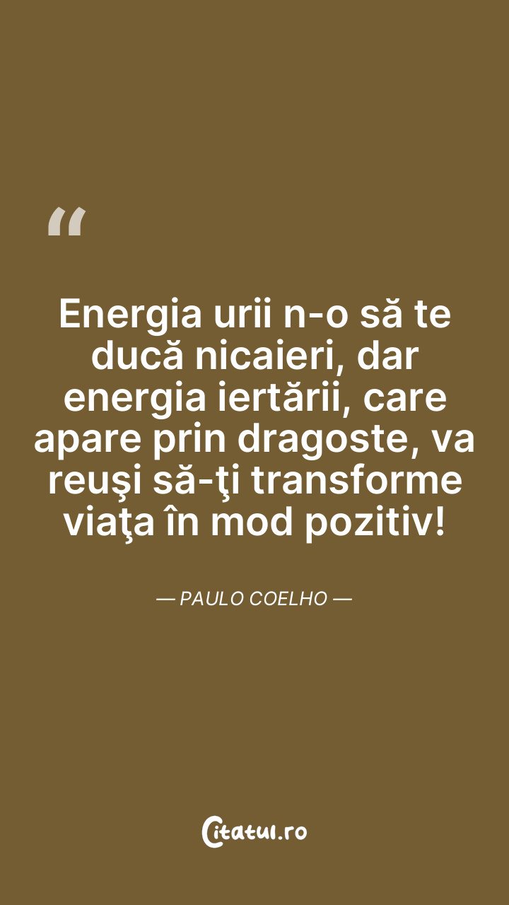 Energia urii n-o să te ducă nicaieri, dar energia iertării, care apare prin dragoste, va reuşi să-ţi transforme viaţa în mod pozitiv! Paulo Coelho