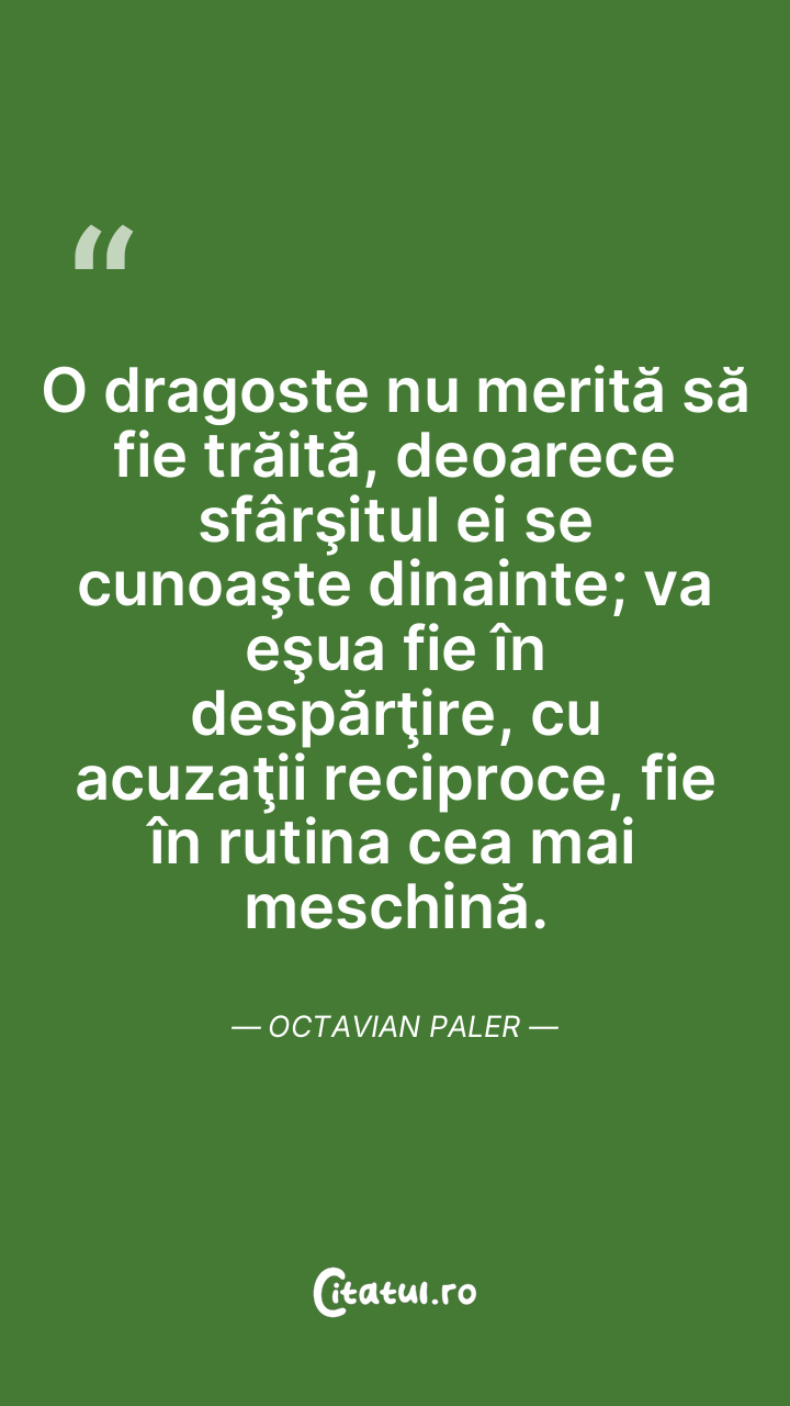 O dragoste nu merită să fie trăită, deoarece sfârşitul ei se cunoaşte dinainte; va eşua fie în despărţire, cu acuzaţii reciproce, fie în rutina cea mai meschină. Octavian Paler