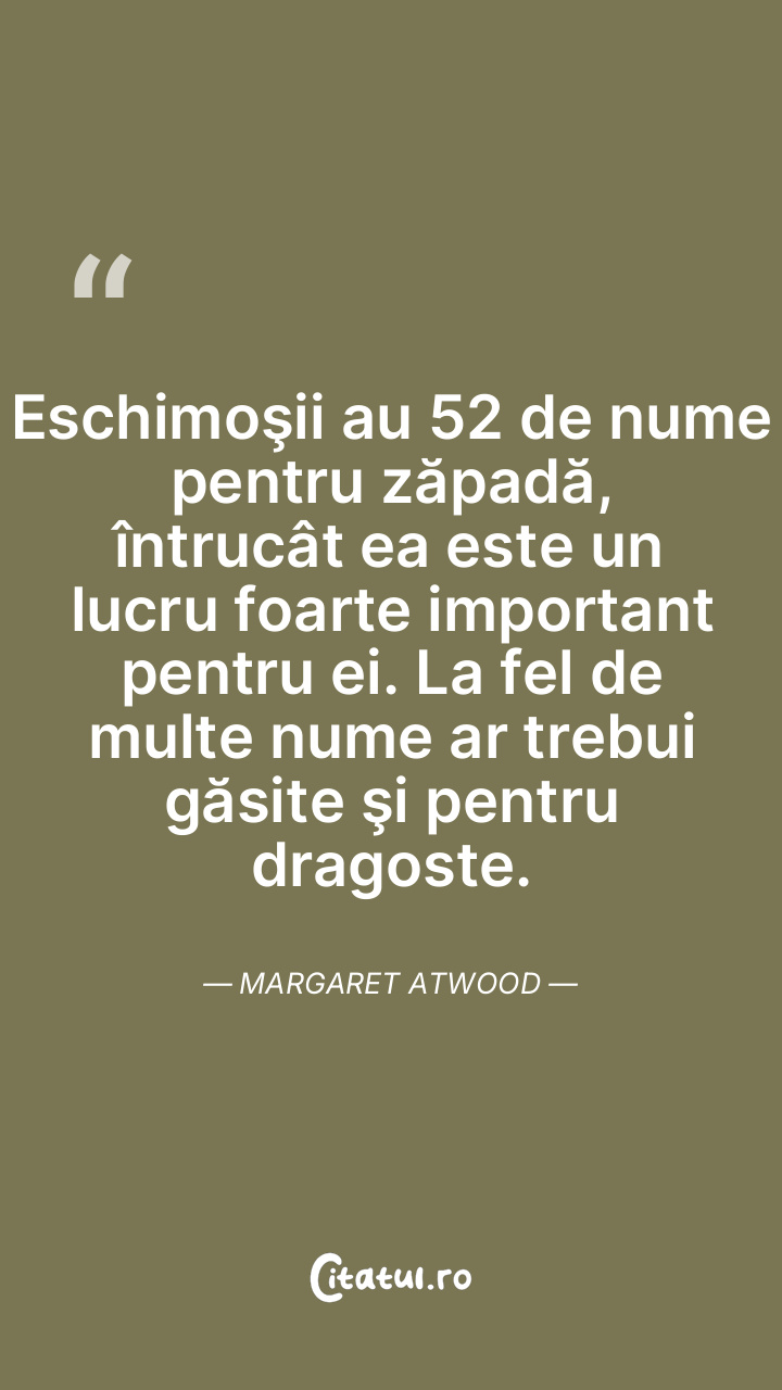 Eschimoşii au 52 de nume pentru zăpadă, întrucât ea este un lucru foarte important pentru ei. La fel de multe nume ar trebui găsite şi pentru dragoste. Margaret Atwood