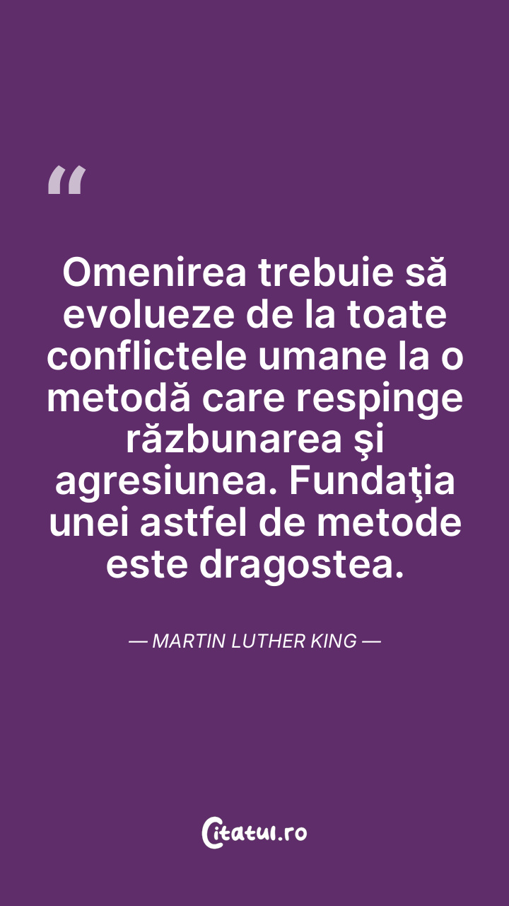 Omenirea trebuie să evolueze de la toate conflictele umane la o metodă care respinge răzbunarea şi agresiunea. Fundaţia unei astfel de metode este dragostea. Martin Luther King