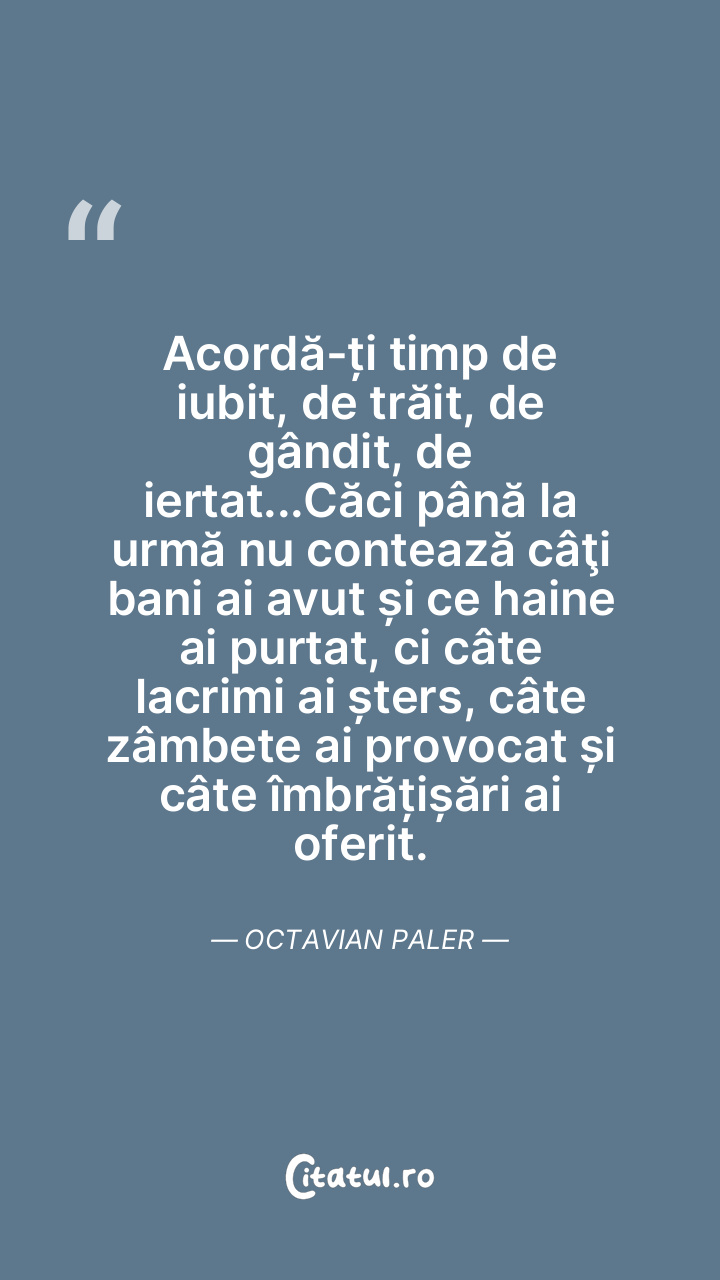 Acordă-ți timp de iubit, de trăit, de gândit, de iertat...Căci până la urmă nu contează câţi bani ai avut și ce haine ai purtat, ci câte lacrimi ai șters, câte zâmbete ai provocat și câte îmbrățișări ai oferit. Octavian Paler