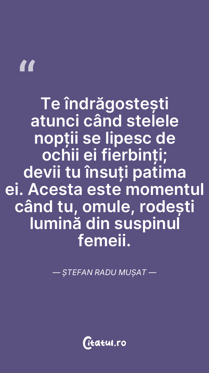 Te îndrăgostești atunci când stelele nopții se lipesc de ochii ei fierbinți; devii tu însuți patima ei. Acesta este momentul când tu, omule, rodești lumină din suspinul femeii. Ștefan Radu Mușat