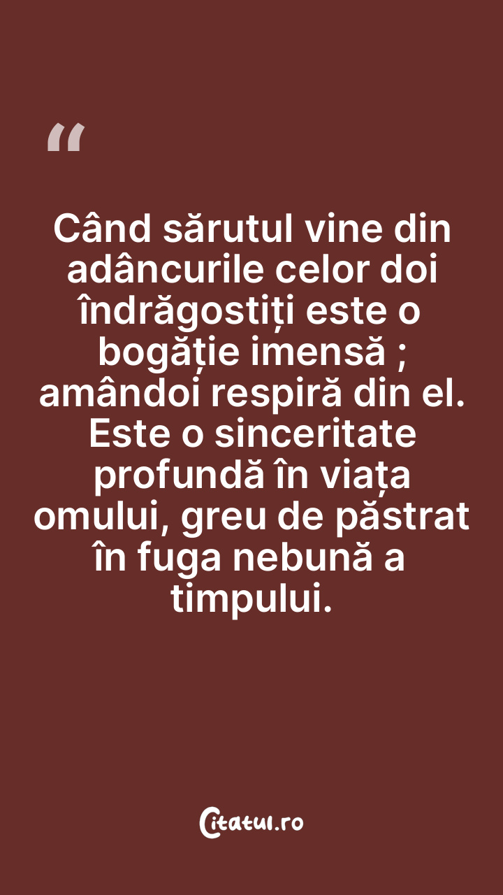 Când sărutul vine din adâncurile celor doi îndrăgostiți este o bogăție imensă ; amândoi respiră din el. Este o sinceritate profundă în viața omului, greu de păstrat în fuga nebună a timpului.