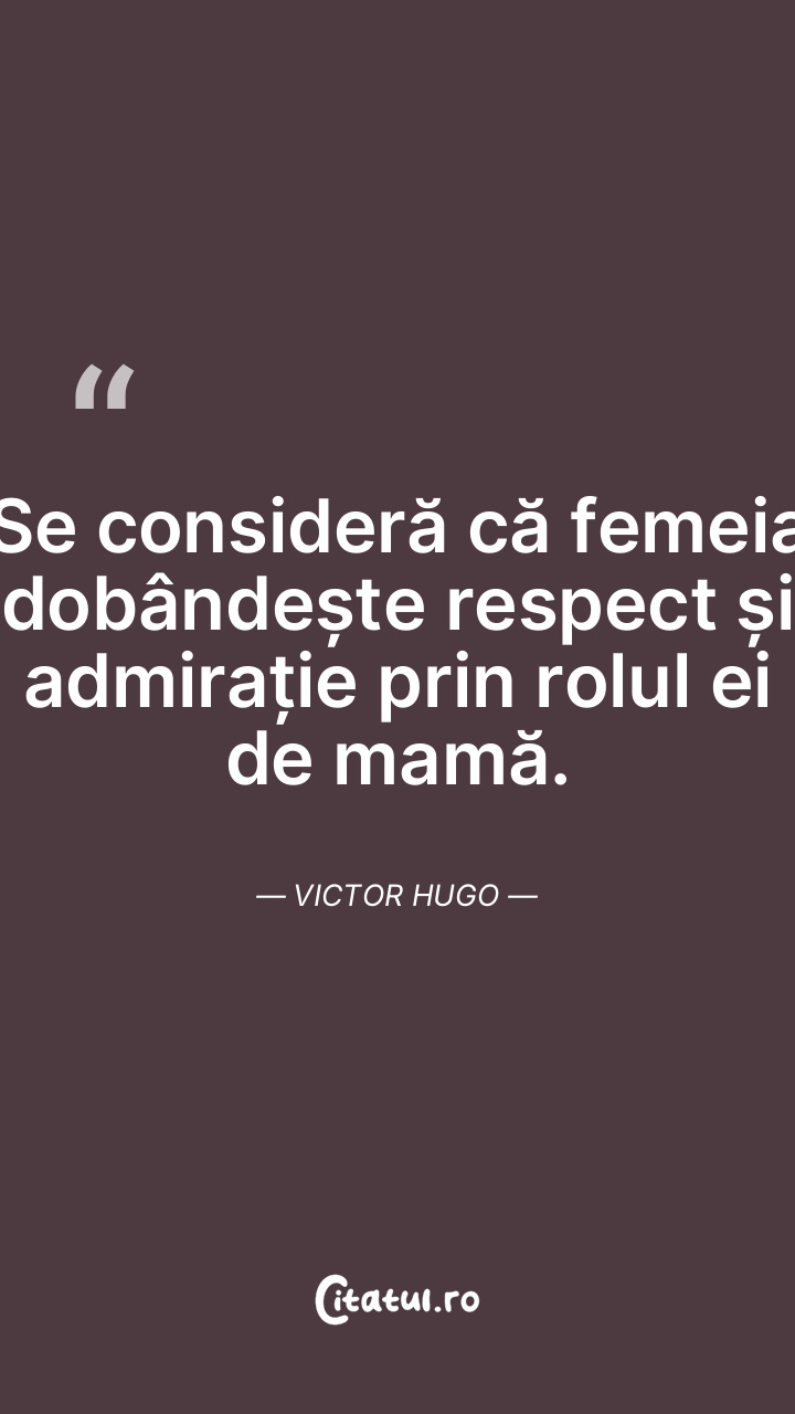 Se consideră că femeia dobândește respect și admirație prin rolul ei de mamă. Victor Hugo