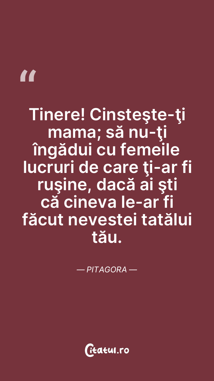 Tinere! Cinsteşte-ţi mama; să nu-ţi îngădui cu femeile lucruri de care ţi-ar fi ruşine, dacă ai şti că cineva le-ar fi făcut nevestei tatălui tău. Pitagora
