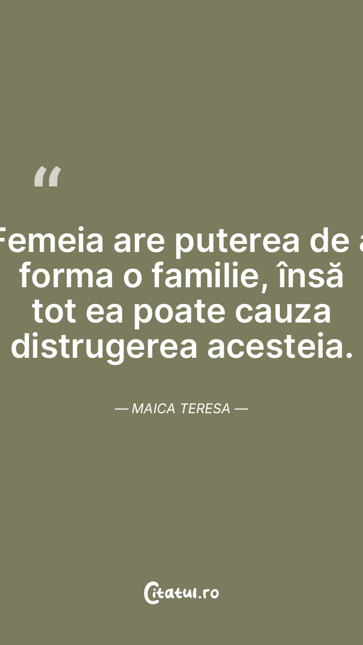 Femeia are puterea de a forma o familie, însă tot ea poate cauza distrugerea acesteia. Maica Teresa