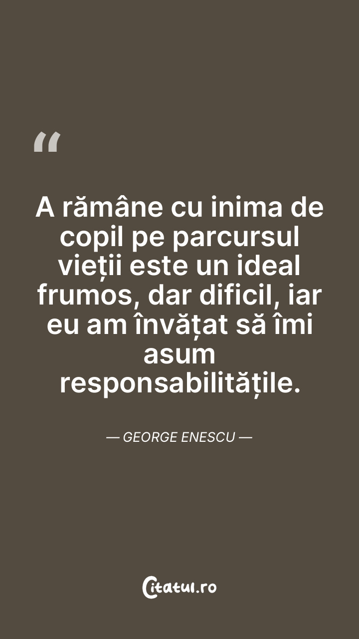 A rămâne cu inima de copil pe parcursul vieții este un ideal frumos, dar dificil, iar eu am învățat să îmi asum responsabilitățile. George Enescu