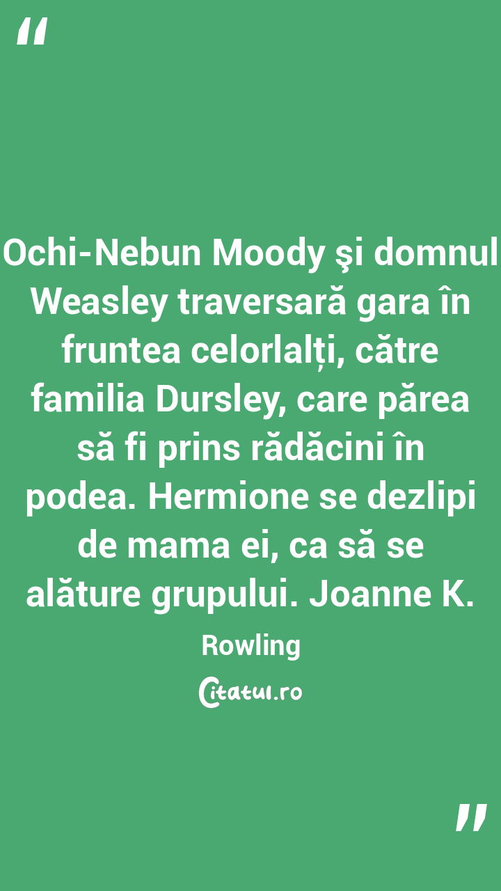 Ochi-Nebun Moody şi domnul Weasley traversară gara în fruntea celorlalţi, către familia Dursley, care părea să fi prins rădăcini în podea. Hermione se dezlipi de mama ei, ca să se alăture grupului. Joanne K. Rowling