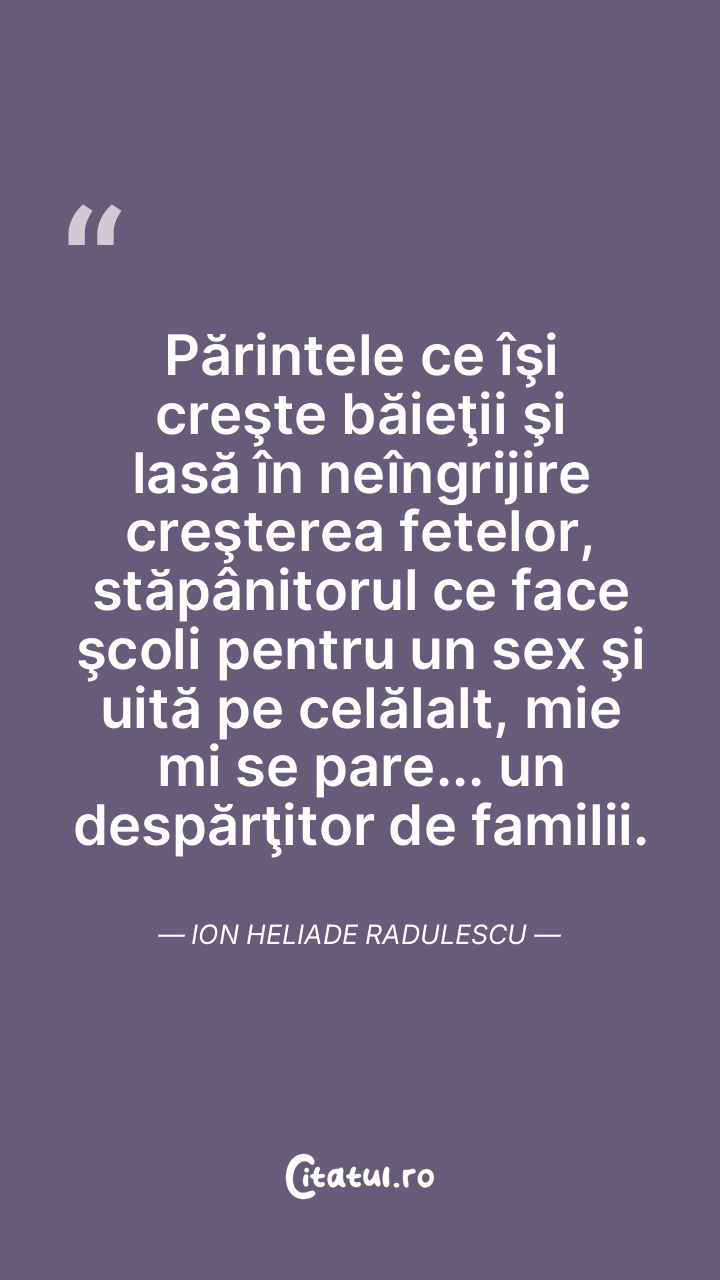 Părintele ce îşi creşte băieţii şi lasă în neîngrijire creşterea fetelor, stăpânitorul ce face şcoli pentru un sex şi uită pe celălalt, mie mi se pare... un despărţitor de familii. Ion Heliade Radulescu