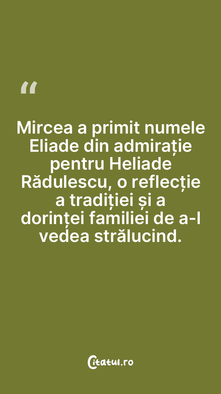 Mircea a primit numele Eliade din admirație pentru Heliade Rădulescu, o reflecție a tradiției și a dorinței familiei de a-l vedea strălucind.