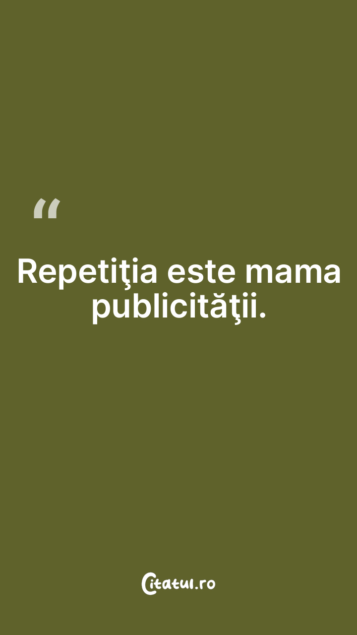 Repetiţia este mama publicităţii. ... Categorie: citate familie Dificultate: Foarte ușor de citit! Votează: ★ ★ ★ ★ ★ (0/5 din 0) Distribuiți acest citat? Alegeți platforma preferată: Salvează citatul in telefon/pc Repetiţia este mama publicităţii. Copiază Favorite Eroare