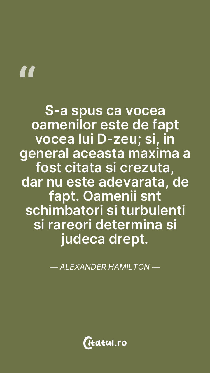 S-a spus ca vocea oamenilor este de fapt vocea lui D-zeu; si, in general aceasta maxima a fost citata si crezuta, dar nu este adevarata, de fapt. Oamenii snt schimbatori si turbulenti si rareori determina si judeca drept. Alexander Hamilton