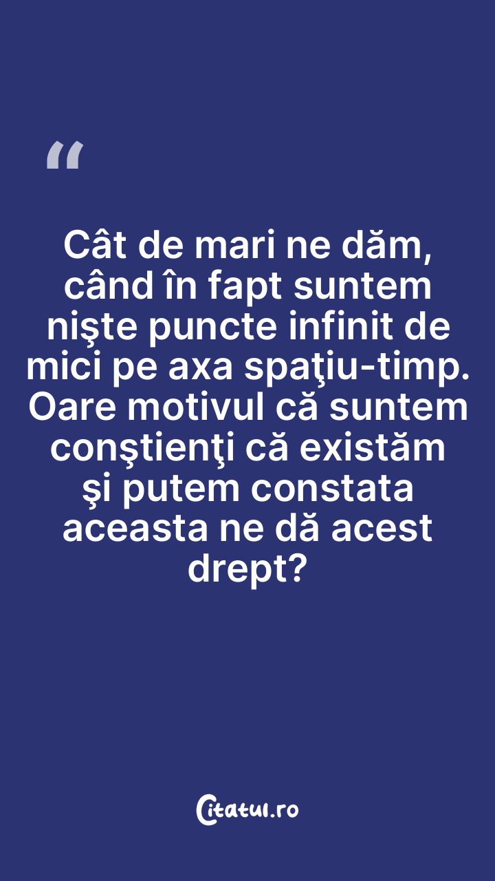 Cât de mari ne dăm, când în fapt suntem nişte puncte infinit de mici pe axa spaţiu-timp. Oare motivul că suntem conştienţi că existăm şi putem constata aceasta ne dă acest drept?