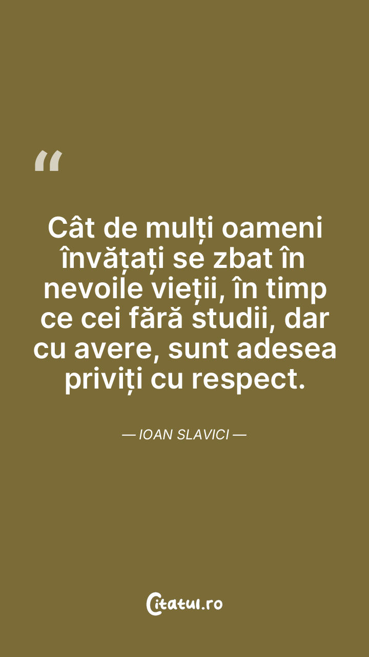Cât de mulți oameni învățați se zbat în nevoile vieții, în timp ce cei fără studii, dar cu avere, sunt adesea priviți cu respect. Ioan Slavici