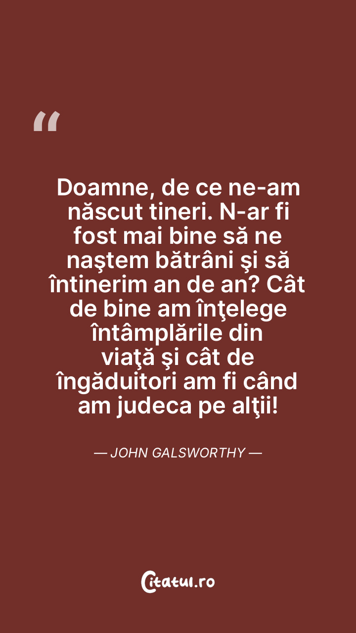 Doamne, de ce ne-am născut tineri. N-ar fi fost mai bine să ne naştem bătrâni şi să întinerim an de an? Cât de bine am înţelege întâmplările din viaţă şi cât de îngăduitori am fi când am judeca pe alţii! John Galsworthy