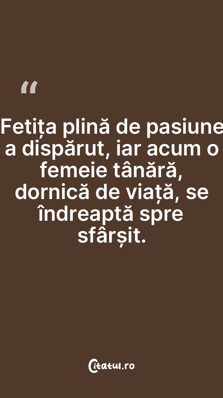 Fetița plină de pasiune a dispărut, iar acum o femeie tânără, dornică de viață, se îndreaptă spre sfârșit.