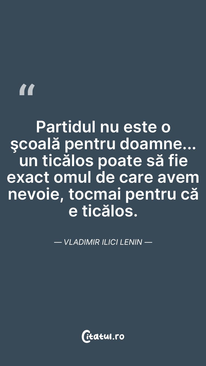 Partidul nu este o şcoală pentru doamne... un ticălos poate să fie exact omul de care avem nevoie, tocmai pentru că e ticălos. Vladimir Ilici Lenin