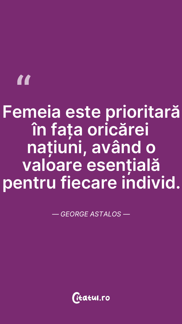 Femeia este prioritară în fața oricărei națiuni, având o valoare esențială pentru fiecare individ. George Astalos