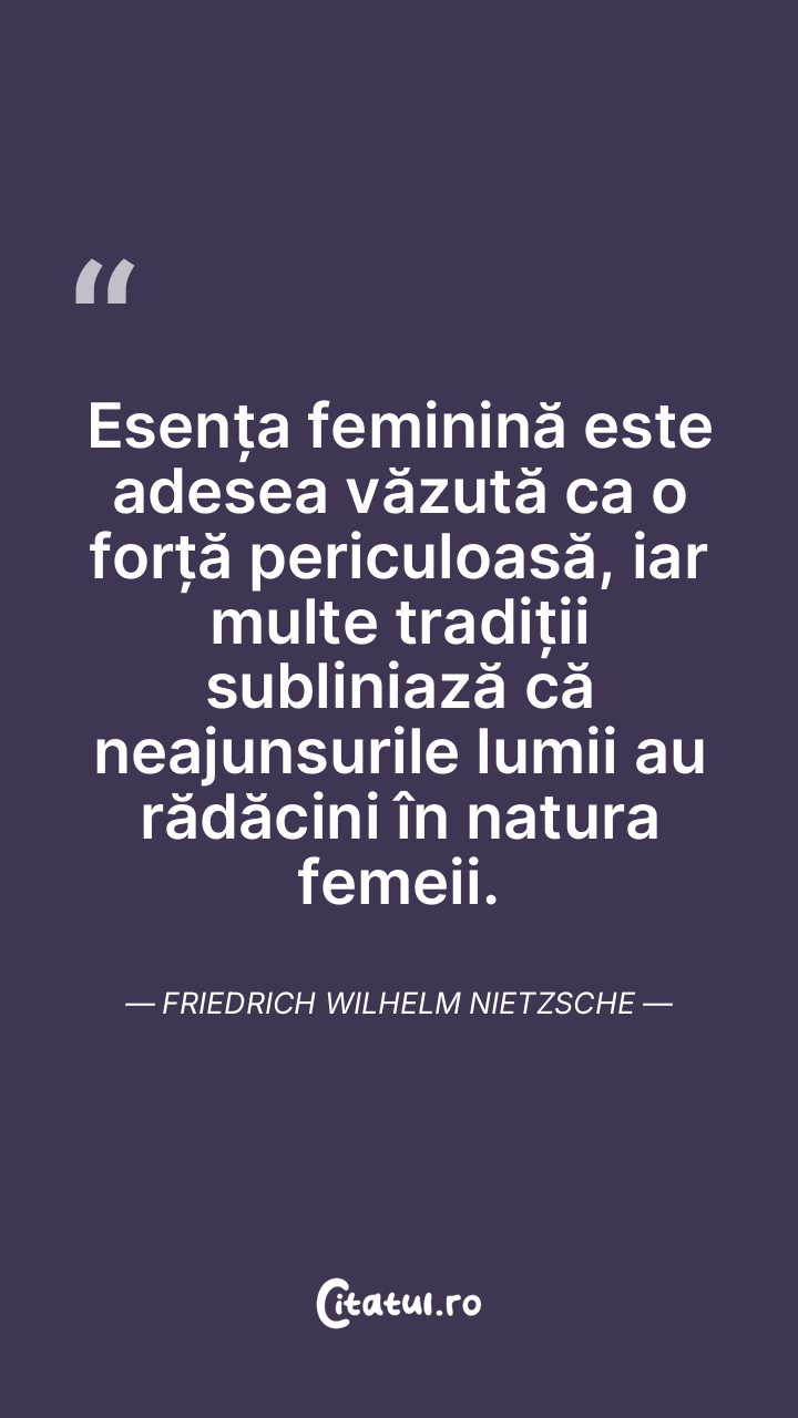 Esența feminină este adesea văzută ca o forță periculoasă, iar multe tradiții subliniază că neajunsurile lumii au rădăcini în natura femeii. Friedrich Wilhelm Nietzsche