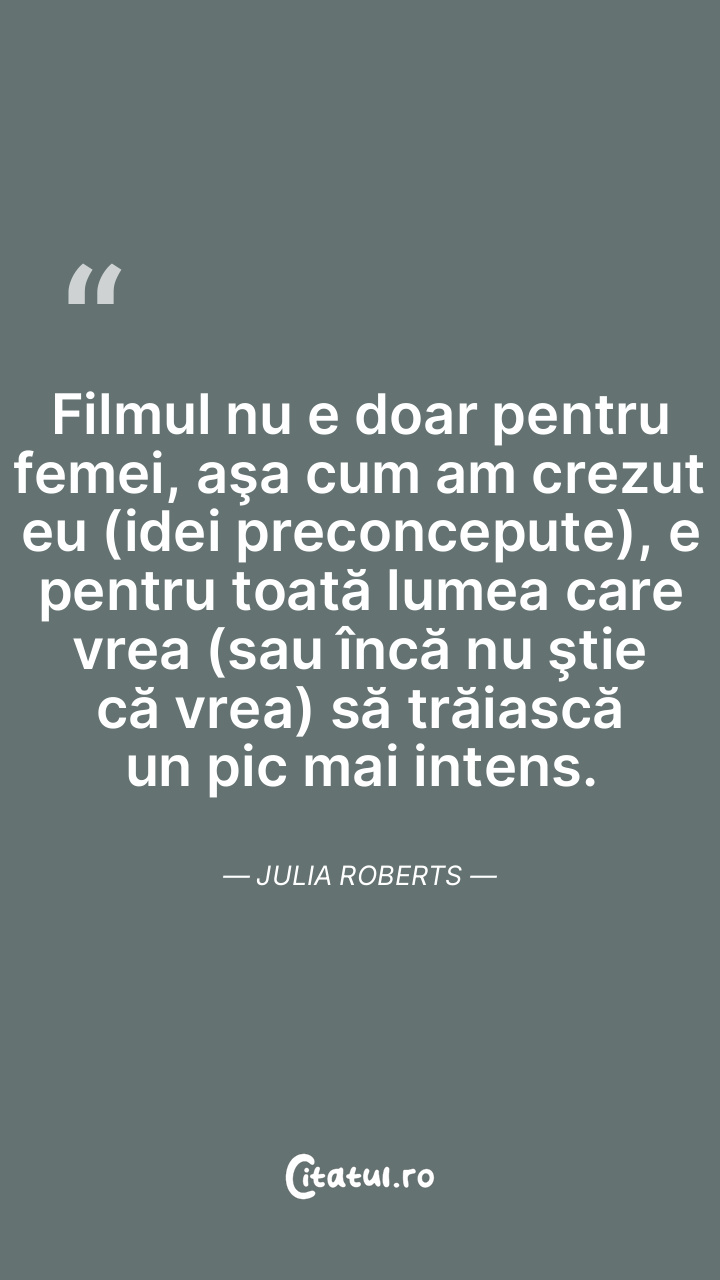 Filmul nu e doar pentru femei, aşa cum am crezut eu (idei preconcepute), e pentru toată lumea care vrea (sau încă nu ştie că vrea) să trăiască un pic mai intens. Julia Roberts