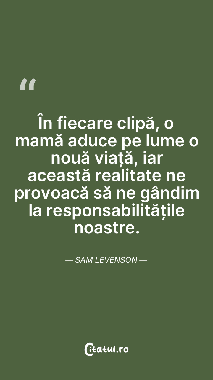 În fiecare clipă, o mamă aduce pe lume o nouă viață, iar această realitate ne provoacă să ne gândim la responsabilitățile noastre. Sam Levenson
