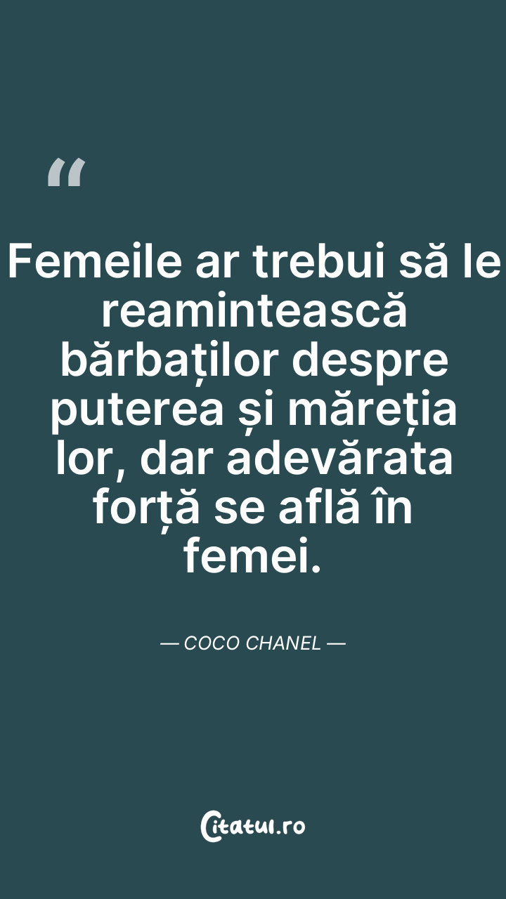 Femeile ar trebui să le reamintească bărbaților despre puterea și măreția lor, dar adevărata forță se află în femei. Coco Chanel