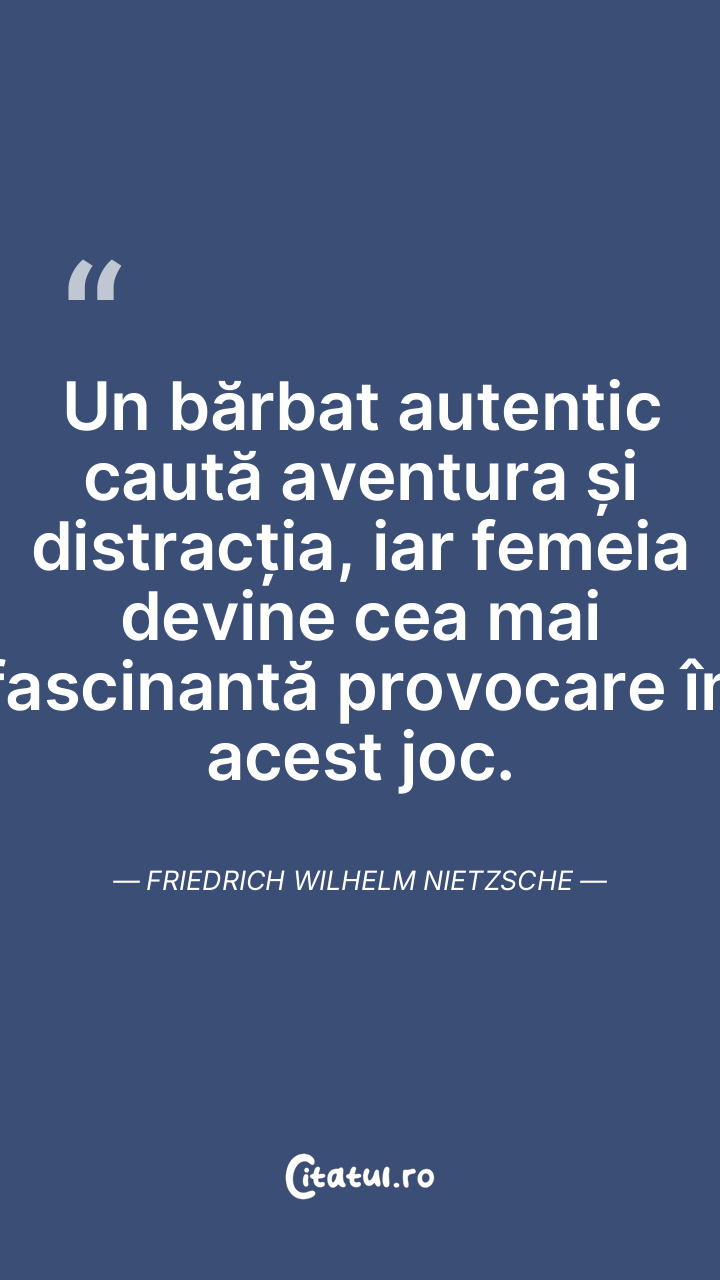 Un bărbat autentic caută aventura și distracția, iar femeia devine cea mai fascinantă provocare în acest joc. Friedrich Wilhelm Nietzsche