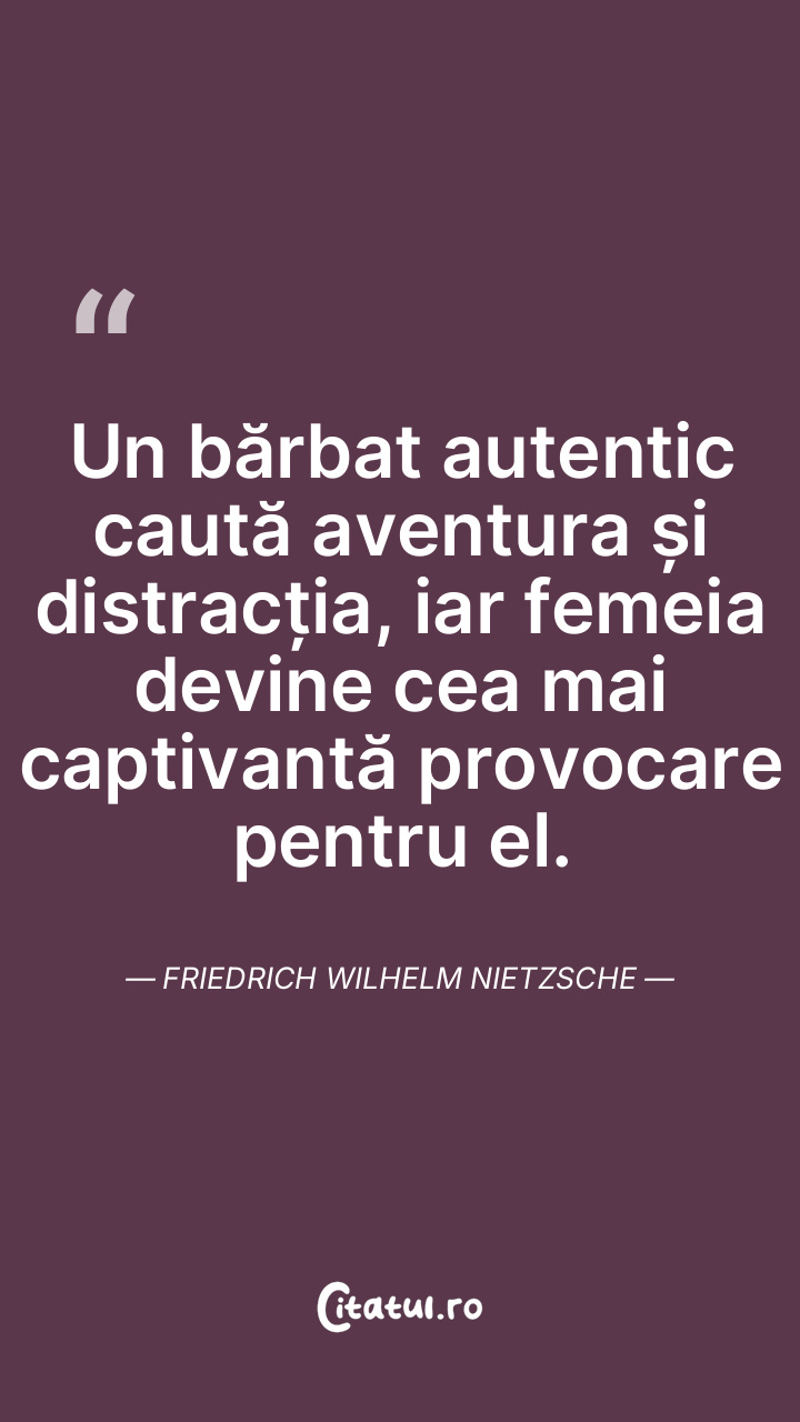 Un bărbat autentic caută aventura și distracția, iar femeia devine cea mai captivantă provocare pentru el. Friedrich Wilhelm Nietzsche