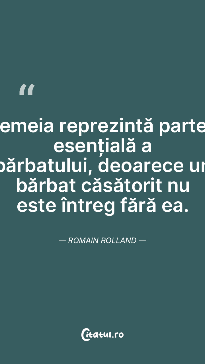 Femeia reprezintă partea esențială a bărbatului, deoarece un bărbat căsătorit nu este întreg fără ea. Romain Rolland