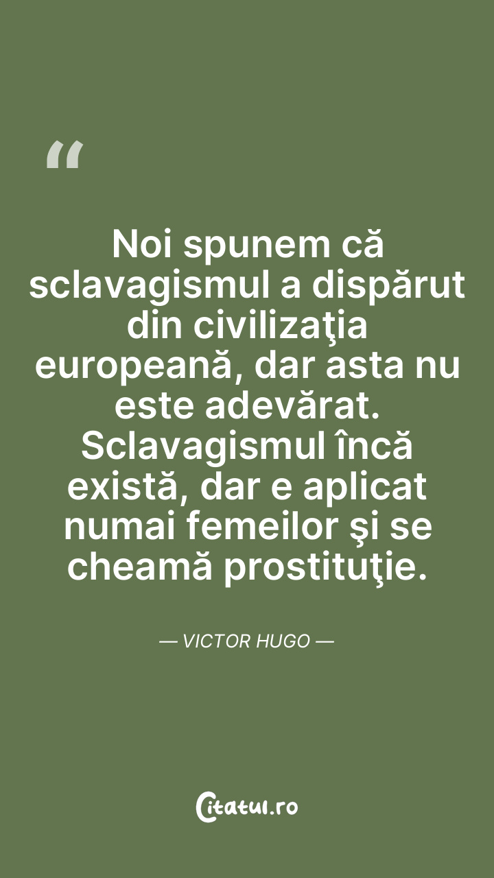 Noi spunem că sclavagismul a dispărut din civilizaţia europeană, dar asta nu este adevărat. Sclavagismul încă există, dar e aplicat numai femeilor şi se cheamă prostituţie. Victor Hugo