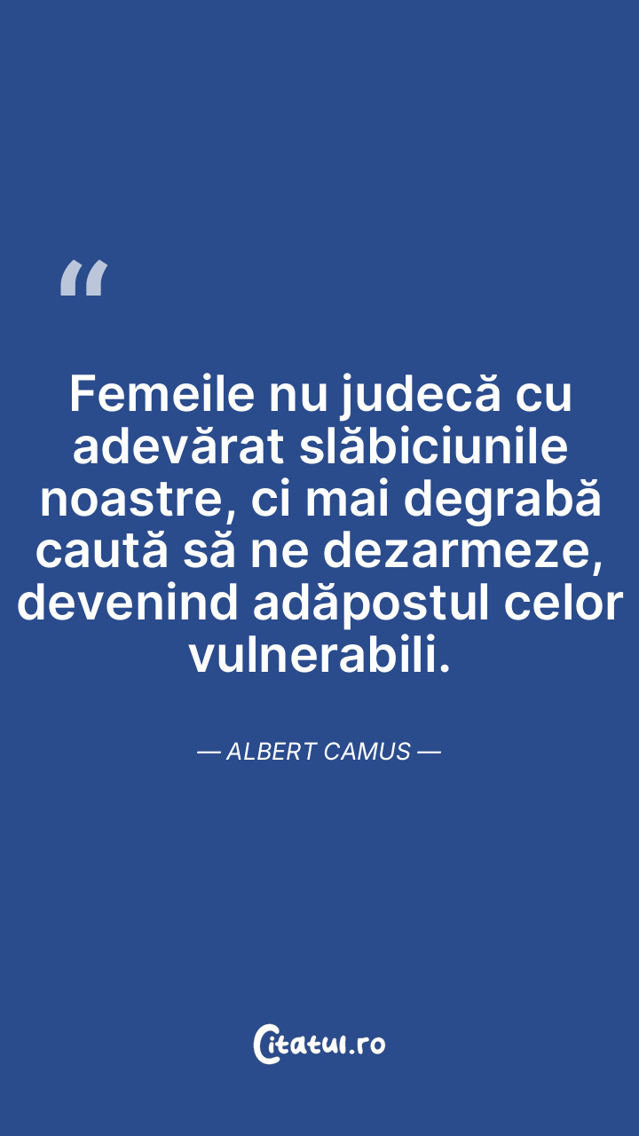 Femeile nu judecă cu adevărat slăbiciunile noastre, ci mai degrabă caută să ne dezarmeze, devenind adăpostul celor vulnerabili. Albert Camus