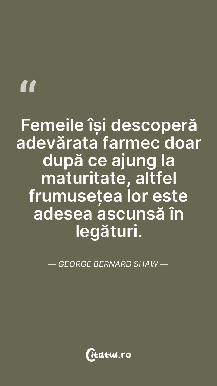 Femeile își descoperă adevărata farmec doar după ce ajung la maturitate, altfel frumusețea lor este adesea ascunsă în legături. George Bernard Shaw