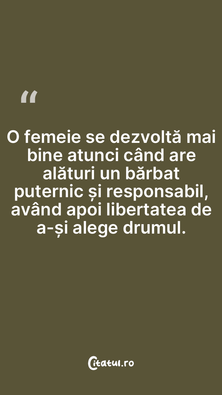 O femeie se dezvoltă mai bine atunci când are alături un bărbat puternic și responsabil, având apoi libertatea de a-și alege drumul.