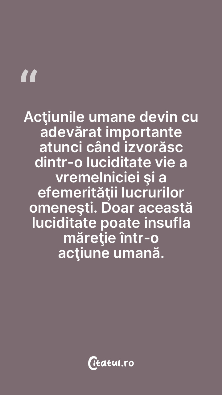 Acţiunile umane devin cu adevărat importante atunci când izvorăsc dintr-o luciditate vie a vremelniciei şi a efemerităţii lucrurilor omeneşti. Doar această luciditate poate insufla măreţie într-o acţiune umană.